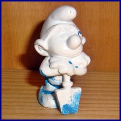 | The following smurfs are officially licensed smurfs from Bully or Schleich with some errors. The errors can be vary from unpainted eyes or mouths to some major errors in the mold (see the flower smurf). Some of the smurfs are also half painted. I am not sure why these were only partially painted, but one theory is that since smurfs are handpainted the painters stopped painting them if they saw a defect in the material or made a paint error (painting a part of the smurf with the wrong color) Some of the smurfs on this page look like they were altered by a previous owner but since it's obvious that they were less than perfect when they left the factory I included them as Error smurfs on this page. |