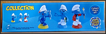 | Candy Toppers are made out of relative hard plastic. They are about 3" high and make wonderful display items. They were available for purchase in Europe as Candy toppers for M&Ms and Smarties. Even among the Candy Toppers there are variations to be found, and they are fun to collect Their markings are Peyo Exclusive CE Licensee: BIP Holland, Licensed thru IMPS (Brussels) |